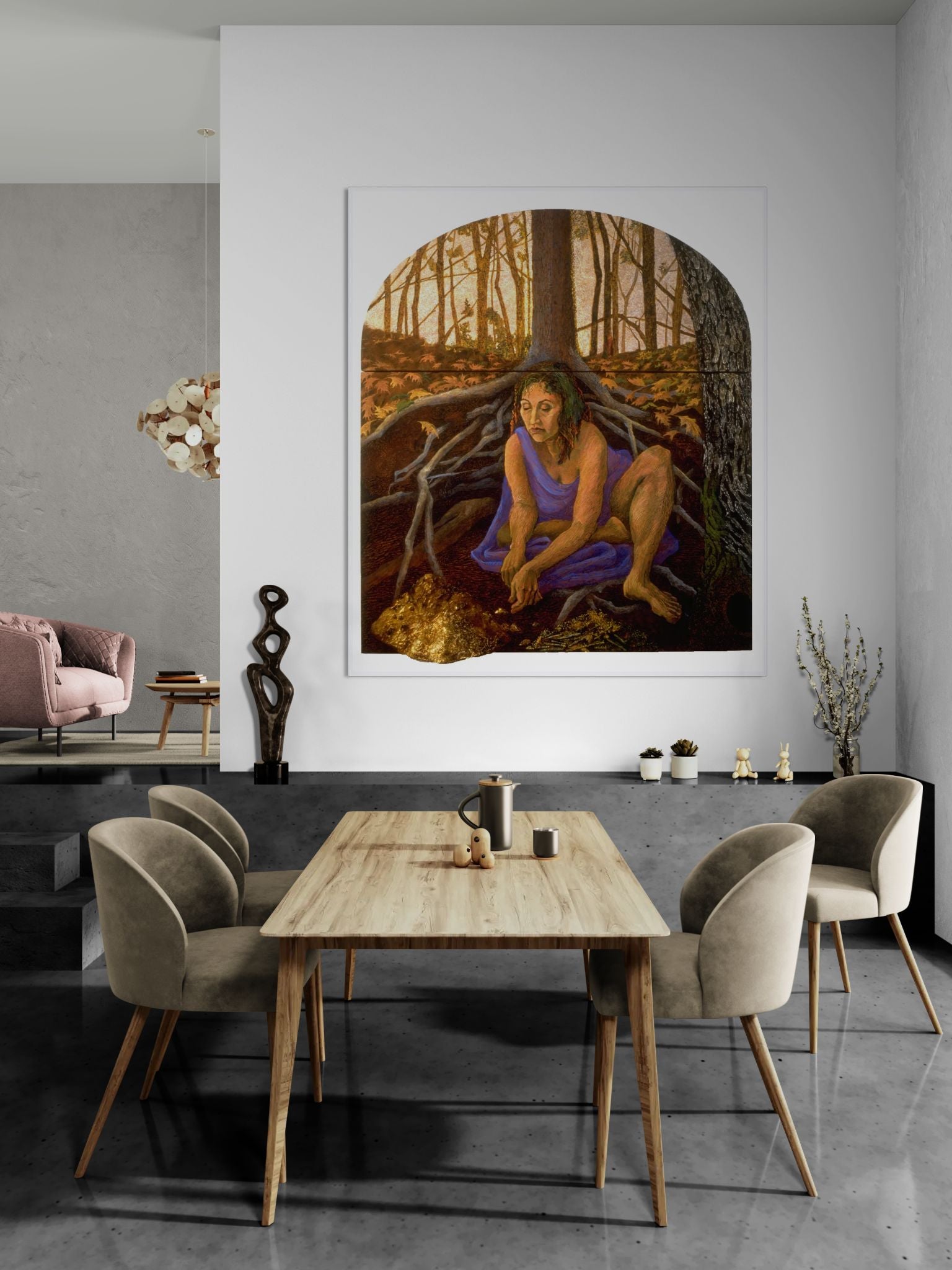 "The Task of Sorting" by Nancy Lu Rosenheim, Homemade Egg-oil Tempera, Dutch Metal Leaf and Mixed Media on Linen